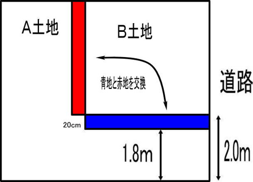 土地所有者Bに折衝してB土地の一部「青地」とA土地の一部「赤地」を交換する契約を結び、土地を分筆し、等価交換による所有権移転登記を申請しました。結果、間口を20cm広げ2.0mになり建築確認を取得しました。