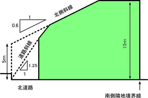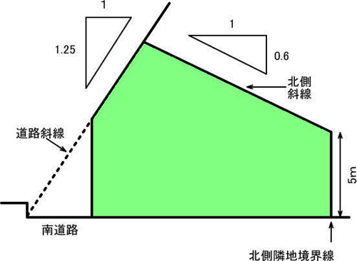 道路斜線は道路反対側境界線から1:1.25の勾配、北側高度斜線(第一種高度地区)は北側隣地境界線(北道路の場合道路反対側境界線)立ち上がり5mから1:0.6の勾配で規制されます。
