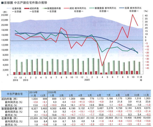 まず東日本不動産流通機構による昨年の首都圏における中古戸建・中古マンションのデータを見ると、4月に第一回目の非常事態宣言が発令された後、成約件数が前年度比ー50%近くと大幅に下落しました。その後成約件数が徐々に増加して11月は前年度比で中古戸建+23.6%増、中古マンション+14.0%増になり1990年5月の機構発足以降、ともに過去最高となりました。