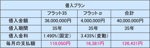 弊社が提携しているフラット35で、100%ローンを組むスキームをご説明します。取り扱い金融機関はARUHIです。 フラット35の融資は完全固定金利(2021年5月の実効金利は1.490%)ですが最高で90%までしか組めません。あとの10%はARUHI独自ローンのフラットα(2021年5月の実効金利は3.435%変動金利)で補完します。 4,000万円のマンションで計算すると下の表になります。